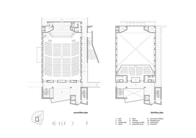 教堂内部系由前厅、大堂、讲台三个序列空间组合而成。步入教堂前厅,为礼拜前后之主要缓冲空间;其后是挑空9.6米的大堂,上下两层可容纳 600个席并可弹性再增200席,是被赋予稳定且宁静的礼拜场所;讲台区则强化了整个教堂的灵性和象征意义。
