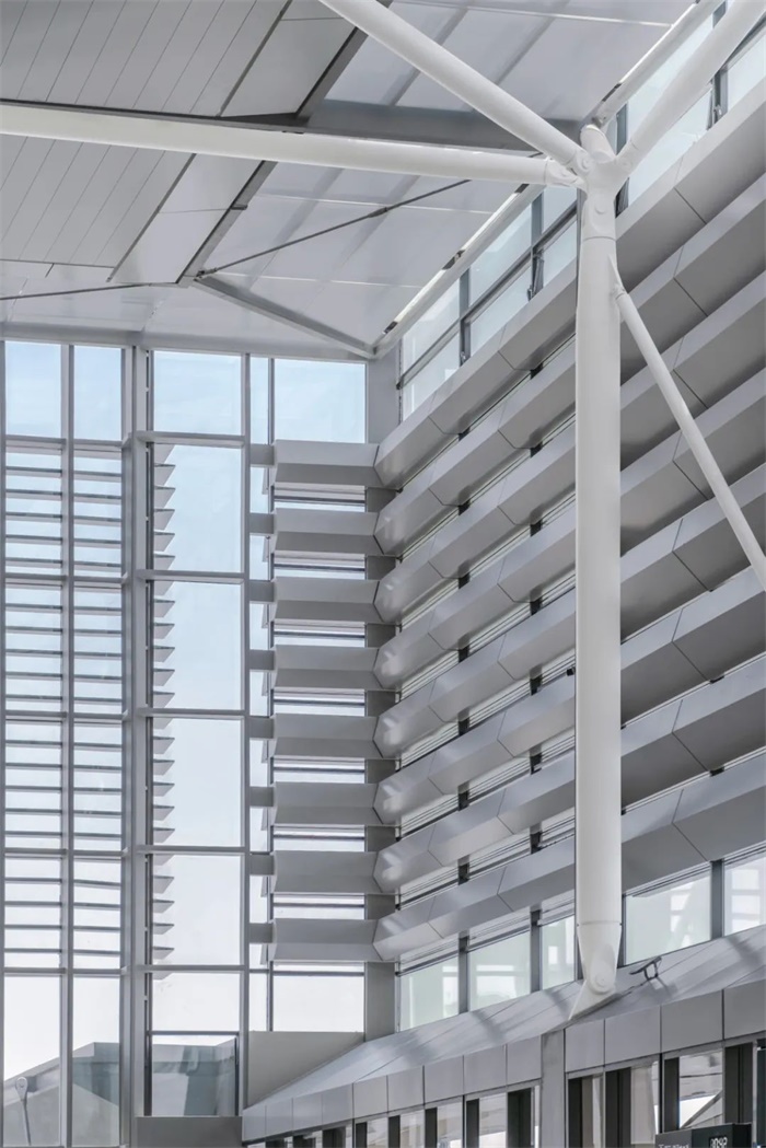 国际联检厅设计了与通风塔相结合的伞形混凝土柱,实现自然通风和自然采光。这些被动式节能措施减少了资源消耗。