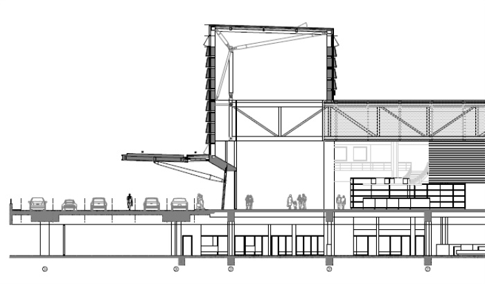 新增结构与混凝土柱铰接设计也是减少柱受力的有效方法,而能够实现铰接连接的前提是屋面、立面、雨蓬三者形成一体化的整体结构,让大悬挑雨蓬的弯矩与大跨屋盖的弯矩内外自平衡,从而最大程度减小支承柱的弯矩,并能呈现出稳重的混凝土基座支托轻盈屋盖的漂浮感。