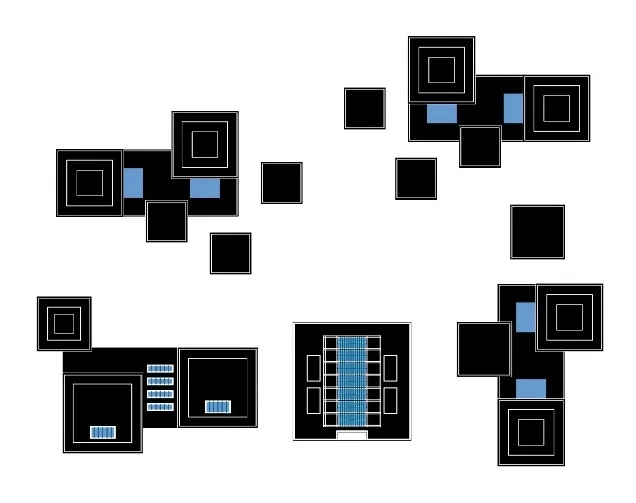 研发建筑共有三个建筑组团,组团一、二拥有两座大型建筑和三座小研发楼,组团三拥有两座较大建筑和两座平面略小的建筑。