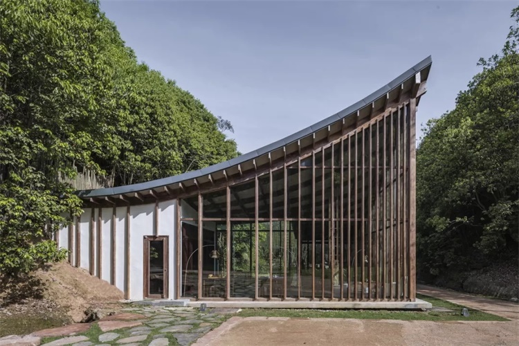 这栋建筑在形态上与山谷客房有着相似之处,即都是迎着谷口的端头立面作为建筑的主立面,而主要的体量则隐匿在谷中。建筑随着山谷地形走势呈现折线关系布置,一层有三个独立的单体“盒子”,主要为公共活动空间,穿插其间的是几处半户外的“亭子”空间。这些空间由一条边廊连接。二层为卧室等私密空间,成线状排布成一条通长的“廊桥”结构,连续的竹钢格栅立面增加了“廊桥”在结构视觉上的整体性。在实际的功能划分上,多数使用状态下二层的卧室等私密功能是独立分割的;只在必要时可以通过二层的走道相连接。屋面三角的折面关系使整体形态更相似与传统坡屋顶的意向。