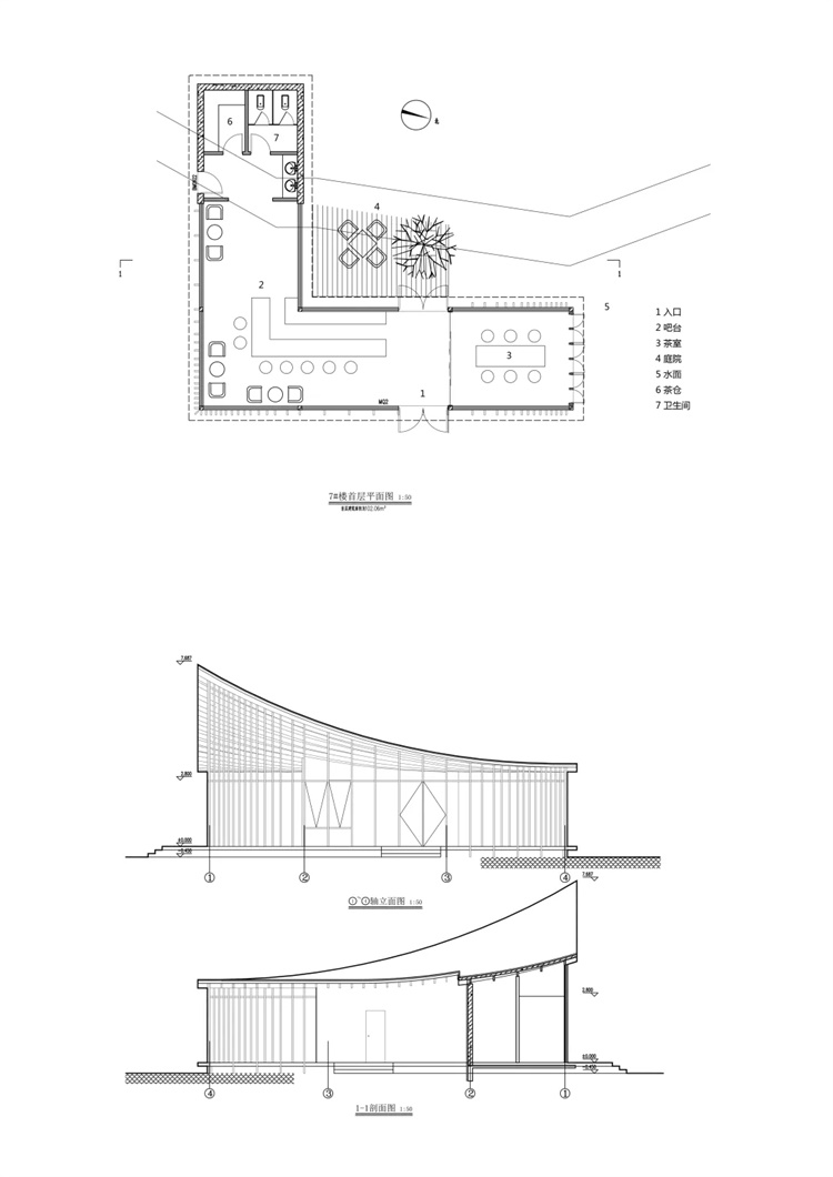 茶室东侧立面在布局上与接待堂东侧立面形成一条轴线,以求得在主要视点透视线上的连贯性。茶室的总面积为109平方米,是一个 “L”形的半围合院落,一端契入山体,另一端延伸并挑出到池塘上空。转折处的屋角约8米高,指向东南向的天空。这个“屋角”成为三条山谷会合处的空场的标识物,也成为和接待堂呼应的轴线上的制高点。屋面连续向两端陡降,形成一个狭长的内斜屋顶。立面通高的玻璃幕墙不仅带来了更宽阔的视觉体验,还给室内提供了充足的自然光线。