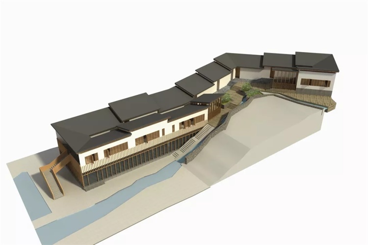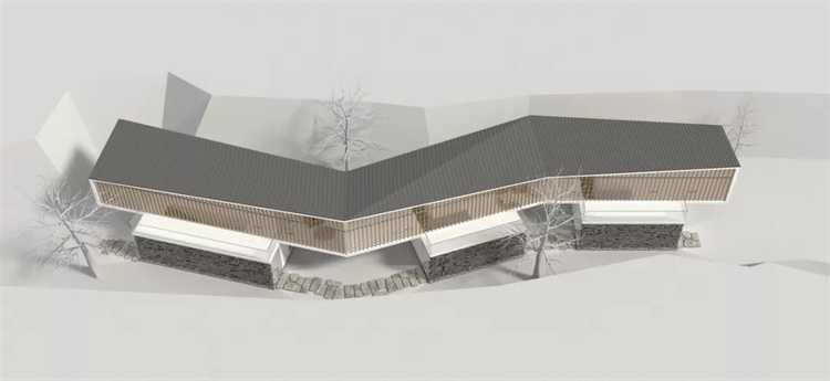 这一建筑单体总面积约1100平方米,建筑形态完全契合原有的山谷地形,呈折线形随地势逐级抬高,通过高低错落的坡屋顶围合构成具有南方乡村特征的巷道空间。巷道两侧的客房屋顶成V字形态,从总体的形态上和接待堂,书院建筑是一致的。单坡屋顶相对于客房而言,为室内提供了更好的观山视野。