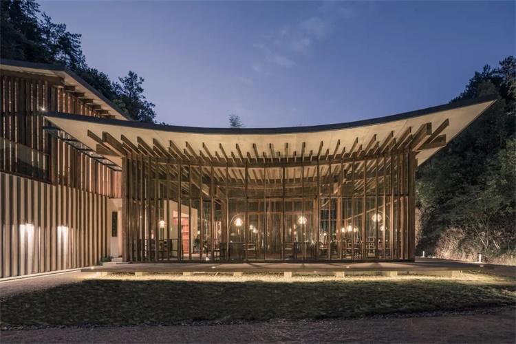 西侧连接接待大堂的部分,是一个几乎完全契入山体的部分,主要布置了厨房、餐厅包间、小展厅等辅助功能。一个巨大的单坡屋顶顺山势倾斜,与接待大堂的屋顶形成叠落的关系。为了达到更轻薄的形体效果,建筑主体采用竹钢搭建,竖向的立柱每根都为承重住,从而达到均匀受力的效果。“柱”与“梁”的连接部分采用简单的交错堆叠起来进行构造的方法,使其在形式上产生出类似斗拱结构的效果。而屋顶则采用GRC预制板,直接“平落”在竹钢框架上;屋顶面层采用金属瓦,而非传统瓦,这些做法都极大的减轻了屋顶重量,使整体结构轻量化,更传达出一种具有现代气质的南方建筑的秀美。