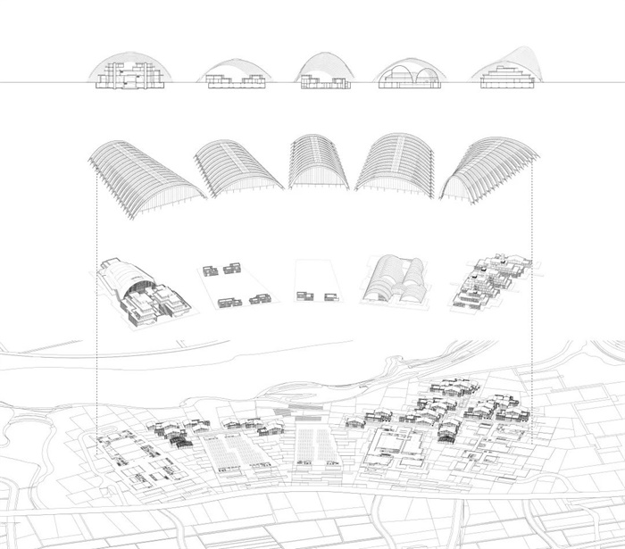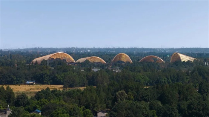 建筑形体取义于成都平原远望层峦叠嶂的远山意向,并提取丰收时节风吹稻浪的建筑形态和色彩,转换为建筑屋面的优美形态和丰富色彩,形成六个别具特色的曲面形体,与大地轻盈相接,成为大田景观的一部分。
