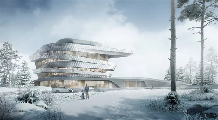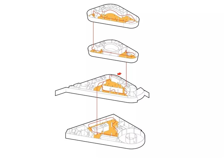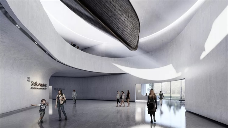 面对有限的建设用地,设计通过博物馆内、外两组流线的组织,推导出盘旋交织下小上大的倒圆台建筑形式,为底层留出充分公共空间和回旋场地的同时,也顺势在视觉上形成了如多股水流盘旋交织而上,建筑由水而生的识别性。