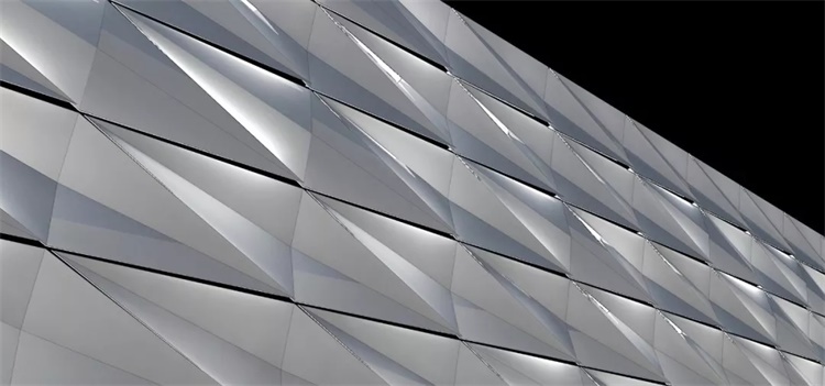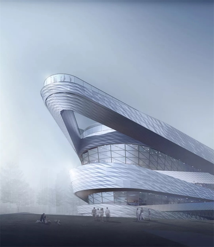 在当代数字技术的帮助下,以单元式钛锌板幕墙交错“砌筑”,不同尺寸的外凸、内凹或平板的钛锌板单元幕墙环绕于建筑表面形成一系列立面肌理的变化,并在不同的光环境下呈现出波光粼粼有如水波般的图像,这一形式亦恰好映射了王安石 “波者,水之皮也”的字意解读。