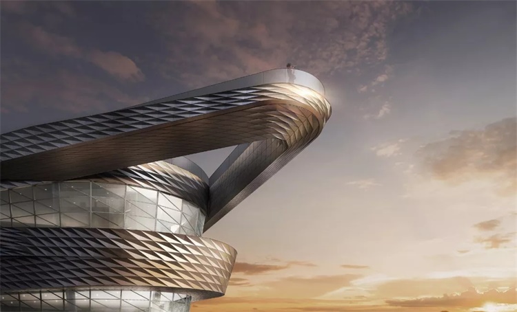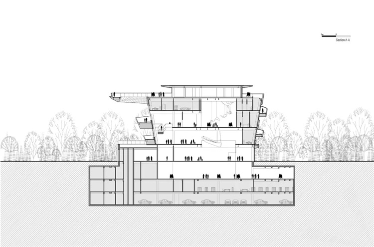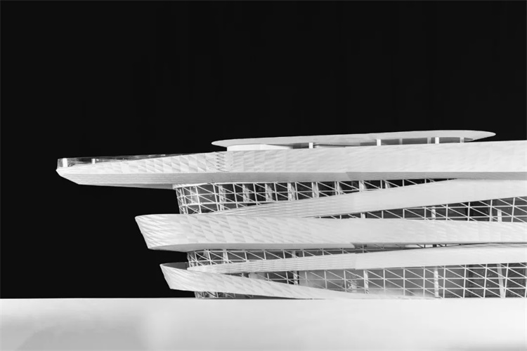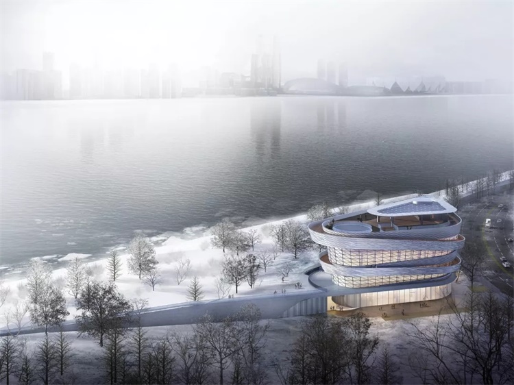通过螺旋上升的步道,多股不同目的的人流将最终交汇在钱塘江博物馆的屋顶,大尺度的悬挑观景台,则成为了城市的公共空间无限延展的一个象征,博物馆的公共属性也在此得到了进一步的升华。