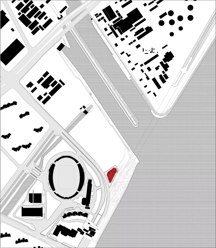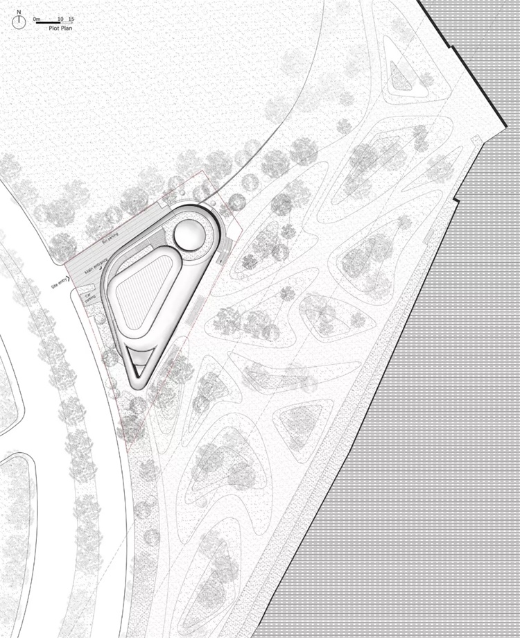作为滨江步道与运河绿廊的交汇与延伸,建筑师在低于堤岸高度的场地上,以人流流向为节点,试图对城市景观做出指导性调整,以融合的态度将场地以草坡的形态自然抬升,形成连接江岸与建筑之间的新路径。