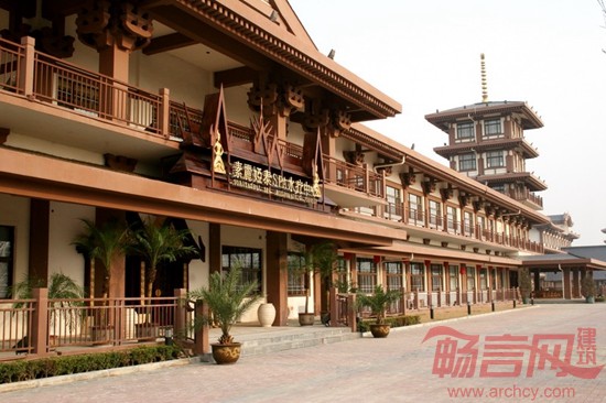 整个建筑群以规模宏大、气势雄伟、细部丰富等予人以强烈的视觉印象。其外部轮廓线设计高低错落、极富层次感,以多重体量关系弱化了大型建筑群的超大尺度。中轴线位置则突出主体大殿,两侧辅以两种不同形式的塔楼,由此构成整个视觉的瞩目点。同时,每幢建筑的入口处均设计一座日式风格的门楼,使其沿街立面更加丰富,主题更加鲜明。而细部构件的精美设计也充分尊重日式构造传统,进一步烘托了建筑群整体的气势与氛围。