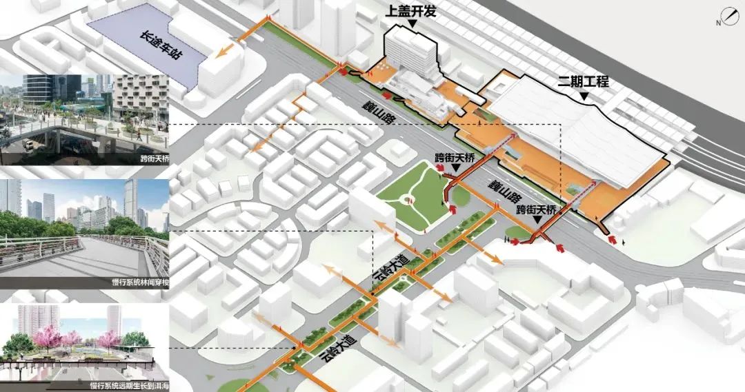 方案在有限的站前空间内打造二层架空平台,将人、车立体分层组织,实现进出站人车分流,互不干扰。同时平台结合景观设计也形成了良好的城市界面与公共活动场所空间。站房形象呼应原有城市轴线,与北侧的洱海公园及高原明珠形成对景关系。为满足全周期的运营需求,结合大理旅游城市的特点,一期建设临时站房,二期新建站房后将过渡站房改造为游客集散中心,不仅可以避免产生废弃工程,而且待远期条件成熟时可同步结合开发,打造城市文旅客厅,提升站域活力。
