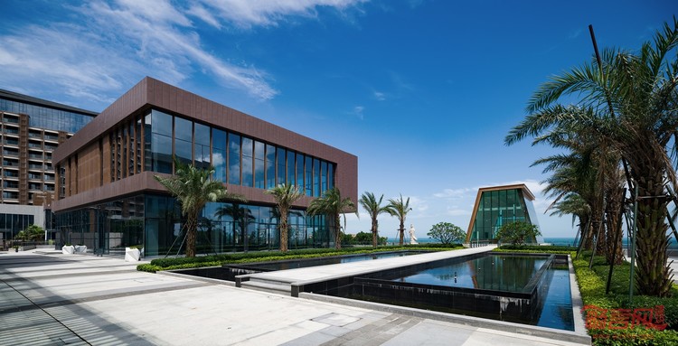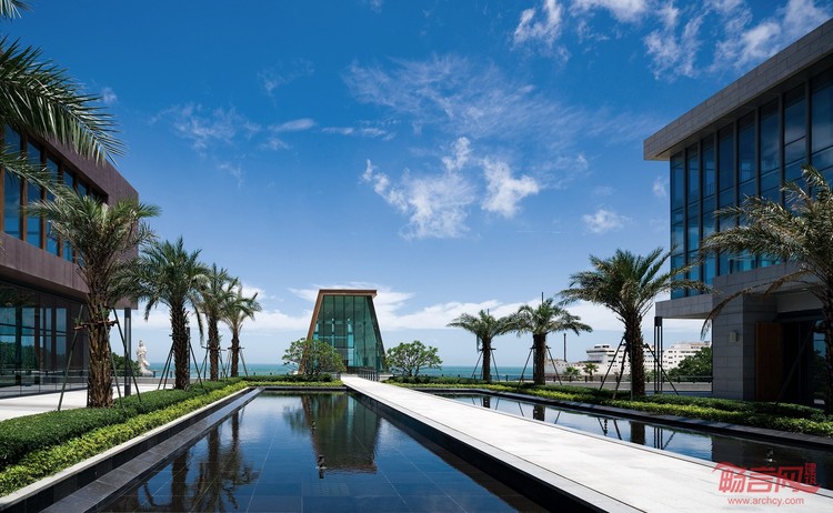 项目通过两条“脊状”建筑空间连接优美景观。街景脊线从地块入口一直延伸到海边,为到达游客营造壮观的印象。与此同时,拥有狭长水景的商业脊线成为餐饮区和酒店之间院落的中轴线。商业脊线的尽头是一座由木纹铝板和幕墙打造的玻璃亭,用作广受欢迎的海滨婚礼和活动场地。