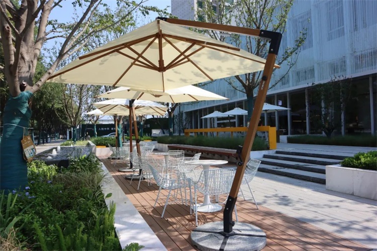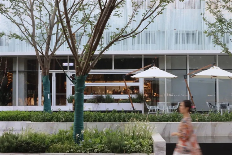 景观前场巧妙利用高差,商业外延区营造丰富的业态环境和适宜的界面尺度,木质温暖座椅、临建筑的外摆活动区、临街的悬挑水景、入口的旱喷景观,泽泽生辉的水雾、斑驳无拘的光影、停僮葱翠的树、灵动生趣的装置,为每一个目之所及的生活场景带来充实的细节与视觉层次,为邻里交流提供林下空间。
