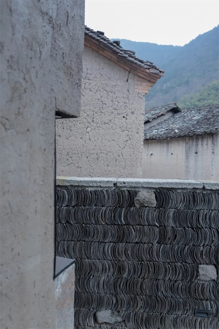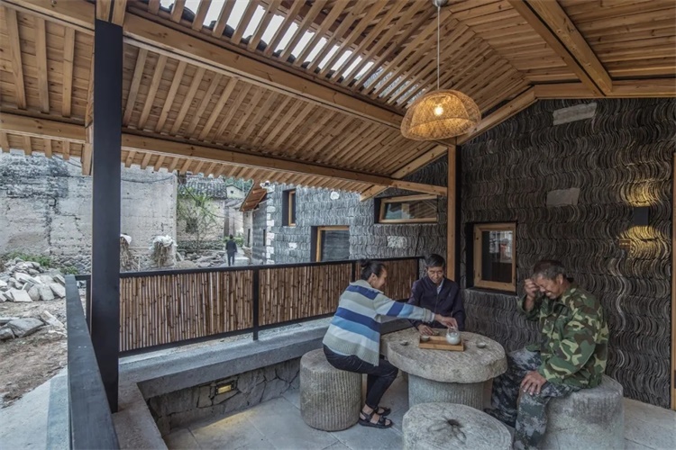 乡村营造存在特有的限制性因素,交通不便,资源匮乏,在建筑材料运用上,利用在地化的材料变成一种建造策略,村落中回收的小青瓦、原建筑夯土墙体材料、当地的毛石砌块、竹子、老石板、回收老木板,水磨石,都是一些在地化的材料,方便就地取材,回收利用,再生环保。