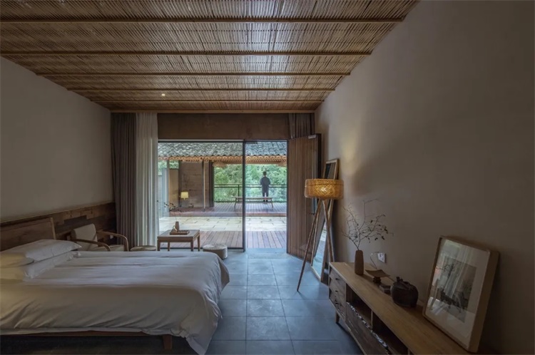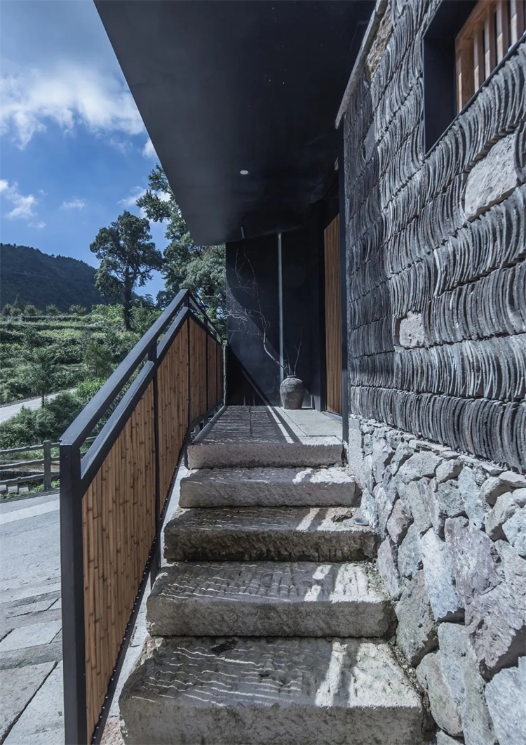 站在场地中,映入眼帘的便是溪对岸的梯田古树和环山,将自然景观引入建筑空间中变成一个重要元素,民宿所有的客房大开窗面都面对梯田和山景,最大限度的把山景映入室内空间。望山亭是专门为了看山而设置的喝茶休闲空间,穿插在内庭院和小溪之间,故意将屋檐口压的很低,站在内院视线是被屋檐高度控制往下看梯田和小溪,当你静坐在亭下便环山入目。