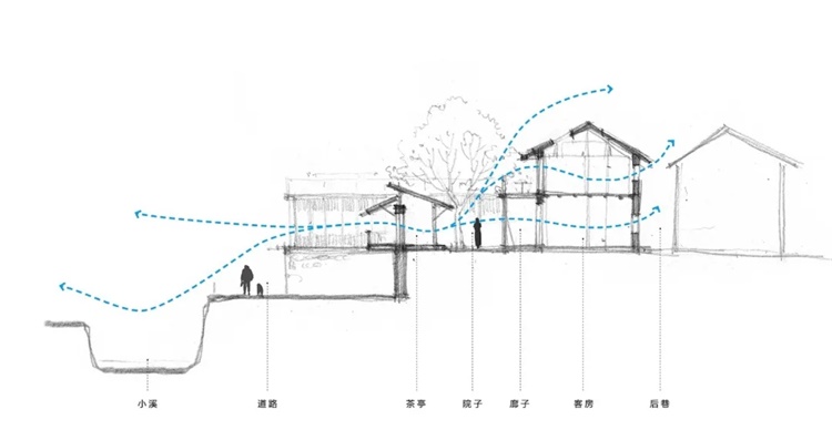 夏天的一个中午,外面的温度很高,在其他的房子里也感觉特别热,我从村子里走入民宿,体感温度一下子就降了下来,廊子里,能感觉到对流的风从中穿过,即使站在有太阳的院子里也感觉不到热,室内就更加的凉爽了。在建筑设计之初就考虑了其通风采光、保温隔热各方面的性能,建筑的体量上沿着地形关系呈阶梯状,在外围墙体上开了很多通风和视线穿透的小窗洞,空气顺着这样的空间形态产生自然风的流动,同时建筑材料也缓解热量吸收,再加上旁边小溪的水面和古树绿荫更加强了建筑的微气候循环。