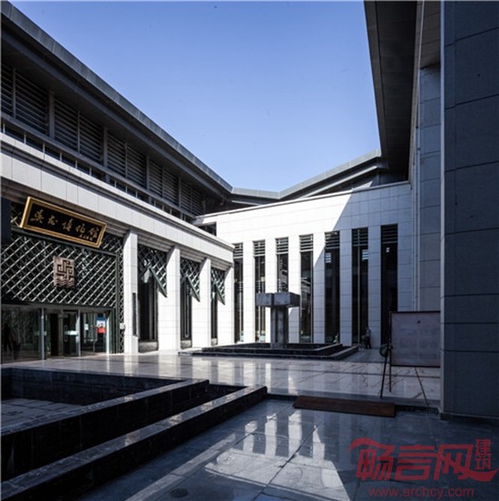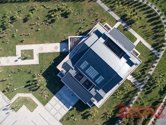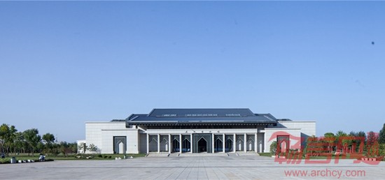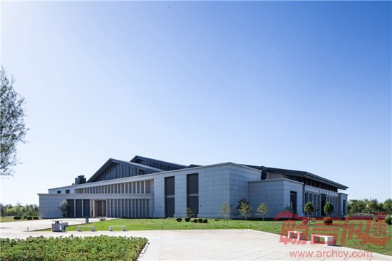 博物馆建筑以方形作为基本型体,通过实体与玻璃相互穿插结合形成大实大虚的强烈对比。建筑外墙以石材为主,造型稳重厚实,体现出黄土高原建筑的厚重特征,屋顶采用平坡结合方式,材料选用深灰色的金属屋面,轻盈飘逸,试图通过现代材料体现传统建筑神韵。