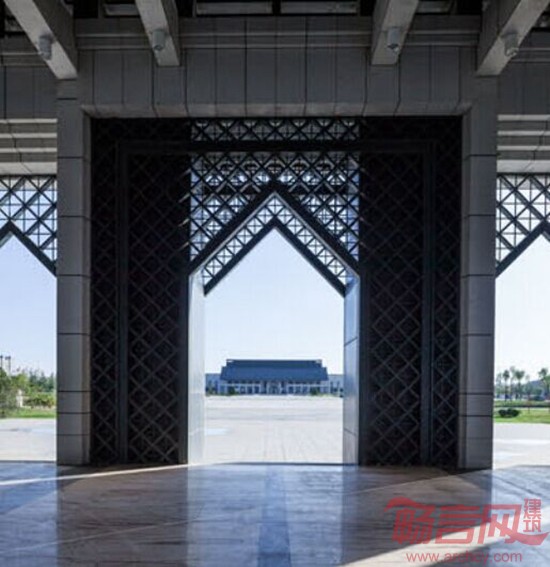 建筑细部采用传统伊斯兰建筑的符号(如尖券,图案),简洁的建筑造型与回族建筑装饰结合,形成了既有时代特征又具有强烈民族特征的现代回族建筑。平面布局采用中轴对称的手法,建筑分为四大功能片区:互动及采购区,主展示区,多功能演示厅,办公区,功能空间通过一系列庭院、中庭串联起来,虚实对比,步移景异。