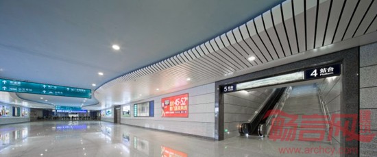出站地道和出站厅是到站旅客获得第一印象的地方,厦门站的地道相对大站明显低矮,天蓝色涂料顶棚结合蜿蜒如水岸的铝条板吊顶,不仅增加了视觉高度、为旅客送上夏日里的清爽,还体现着海滨城市的浪漫风情,简洁的设计语言中蕴含着丰富的内容。