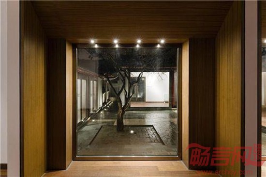 设计主要从两方面入手:一方面,在原四合院的建筑框架中,填充出一系列金属展示窗及木质展示柜,形成传统与现代两种风格的反差与结合;另一方面,在四合院中营造出一种江南意境的园林景象。设计师以这个已经没了窗和墙的内院,以及院子当中的柳树为出发点,说服业主放弃原来比较符号化或装饰性的立面处理,改为完全通透的大面积玻璃橱窗的做法。透明玻璃窗与镀铜不锈钢框的搭配,既是对陶瓷展示主题的回应和对比,也是对四合院最本质的空间形态——院子的致敬。