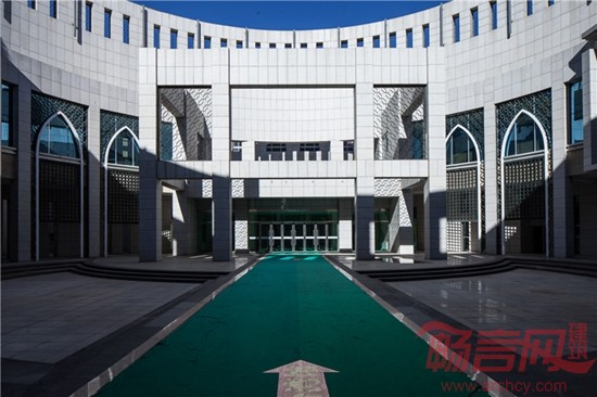 设计运用现代手法,强调整体的富有雕塑感的体量,设计构思来源于对伊斯兰和中国建筑文化特征的提炼,体量简洁,内向丰富,通过简化外部体量关系,突出以水池为中心的内部庭院交错的特色,整体上与传统伊斯兰建筑的空间特征相呼应。白色石材底层落地,与底层落地窗形成强烈的虚实对比,青铜色金属幕墙外皮浮于白色石材建筑体块之上,完整统一,气势雄浑,形成了中国鼎的意向。红色和黄色的剧场及音乐厅体块从青铜色金属外壳中伸出,简洁轻快的色调与带有浓厚文化色彩的青铜色形成对比,使得艺术馆建筑成为赋予城市空间的活跃氛围的现实载体。