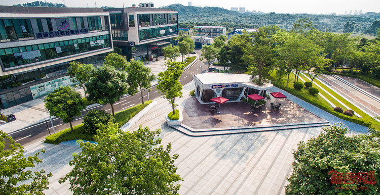 为满足园区的商业需求,在广场上设置特色商业构筑物,将室外经营与广场有机结合, 满足园区商业经营、企业对外宣传、企业与企业之间的交流、人群汇集等功能需求。