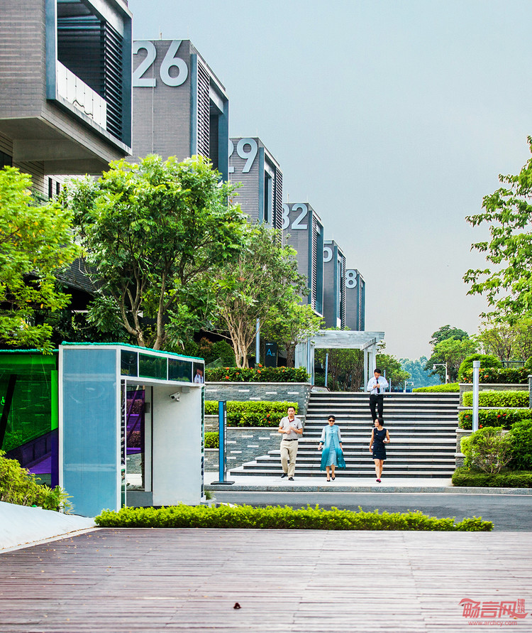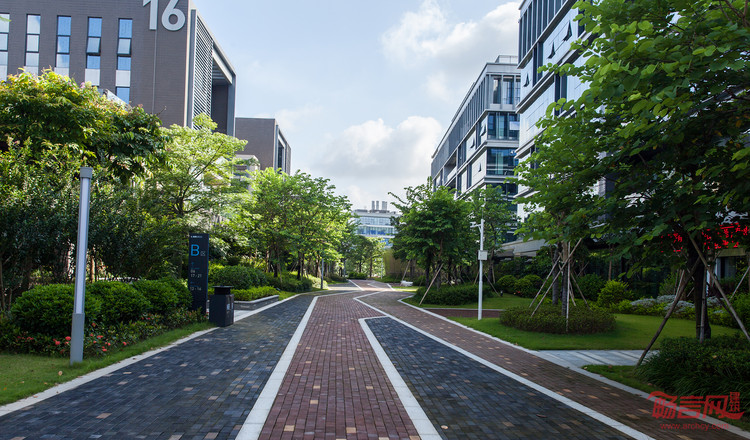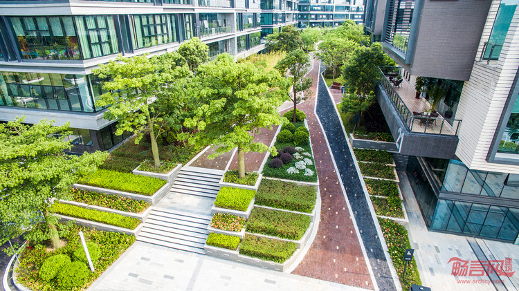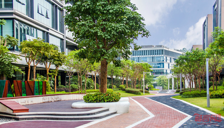 在园区的建筑和道路之间、以及建筑与建筑间,留有大片的绿化空间。这一设置,让西面优越的自然景观能为整个园区所共享的同时,通过公共庭院、半公共庭院、私密庭院等系列的景观序列,带给园区办公的企业不同于一般城市高密度办公空间的花园式办公感受。