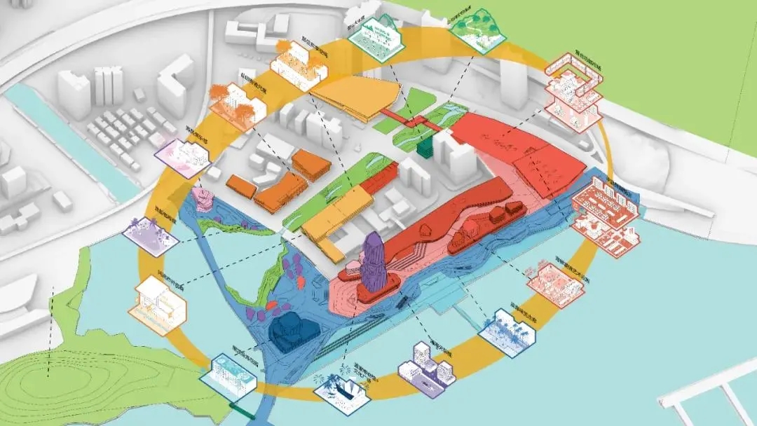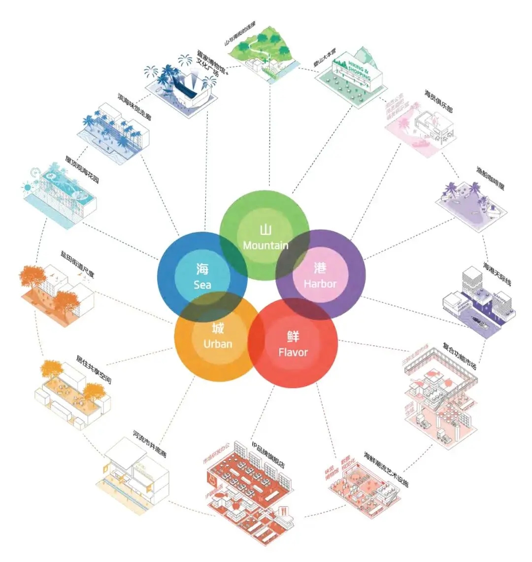 2021年5月正式启动盐田旧墟镇片区城市设计优化国际咨询,经过答疑及初步概念构思沟通、场地踏勘、中期概念汇报等环节,于7月19日召开方案评审会,由涵盖城市规划、城市设计、建筑设计和交通规划等领域的7名专家学者组成评审委员会和盐田区相关部门代表以及规划编制和项目申报单位参加了会议。用地范围约 32公顷,其中包含两个城市更新单元,分别为盐田旧墟镇更新单元(拆除范围用地面积15.9公顷)与渔民新村城市更新单元(拆除范围用地面积2.4公顷)。第一名方案以“山海会客厅、不夜鲜港城”为规划主题,发掘区域潜力,盐田迷人的风味不是单一的海、港、山或城,而是这些元素汇集一处形成的独特魅力,而旧墟区域正是五种元素汇聚的地方。通过功能策划定位,拓展“山味”、“海味”、“城味”、“鲜味”、“港味”的服务功能架构,打造崭新全流程体验空间。