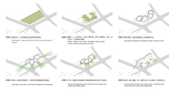由代表着历史、知识和艺术的博物馆、图书馆和美术馆,以及体现着人本关怀的市民中心,汇聚到象征着”大美和顽强”精神的胡杨林下,组成了盛开的雪莲花,.从城市到场地、从理性到浪漫,从规整的几何体到非线性的空间和体量,最终融合成一个有机的整体.,按各个建筑的功能特点组织的动线系统充分考虑了现代展示技术的应用,以期为观众带来全新的使用体验.丰富的形态结合了取自阿克苏白水河里的水刷石材料,建筑立面谨慎地开窗处理充分考量了新疆阿克苏干热气候的特点.也使建筑显得内敛、神秘而又浪漫。