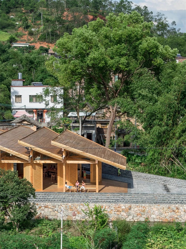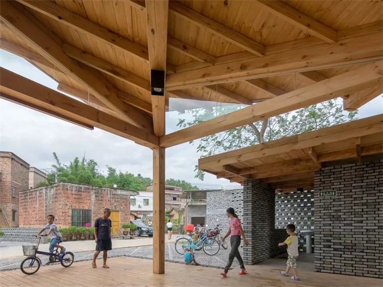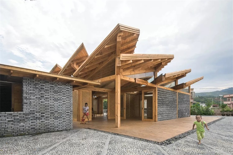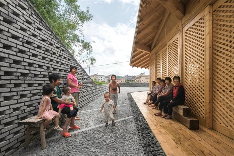 基于村野山水的基地特质,设计师采用了一种迥异于在城市的建造模式,使用自然的材料逻辑——木、砖为主材,以一种融入“自然”的方式介入对场地的改造,为留守的老人、儿童创造一个温暖的庇护所。