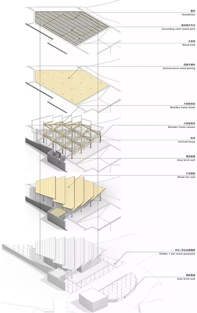 除了面向北侧村路的一层外墙为有局部凸出的青砖砌体填充墙外,其余均为玻璃木框门扇辅以木条斜纹填充。地面用素混凝土砌筑斜向格构(方向与建筑屋顶天窗方向同),内部填充深色鹅卵石,用水泥粘接。