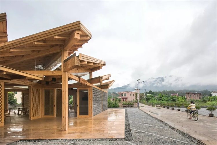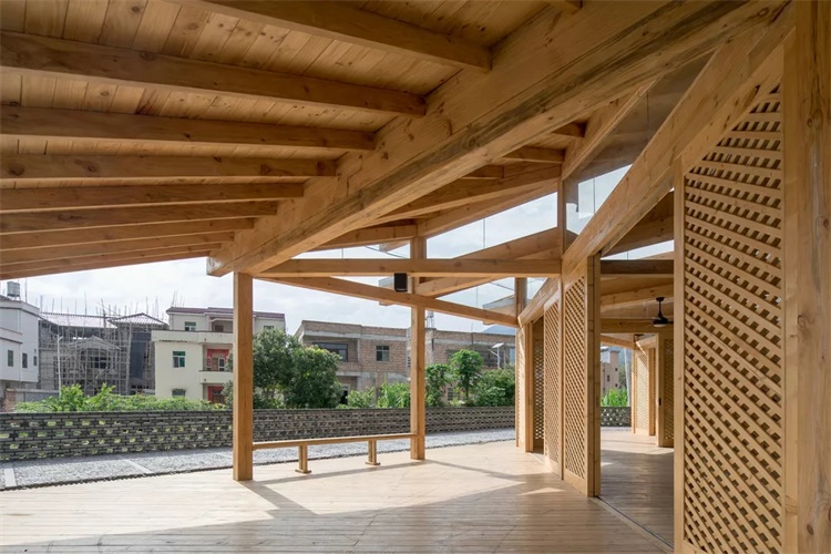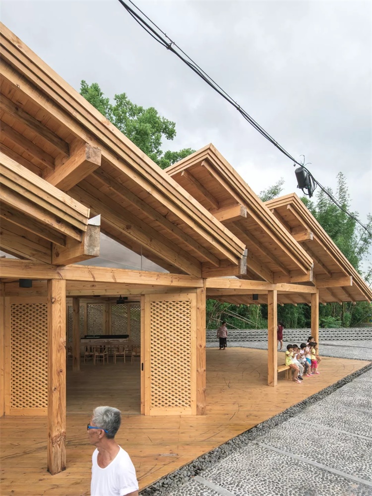 文化活动中心主体建筑置于西南侧梯形用地中央,置于架空木地板的支座上,考虑到功能主要为老人和儿童使用,木地板地面与室外场地无缝连接。社区中心主体建筑4mx4m的跨柱网正交框架3m高的使用空间,3m以上撑起1.5m三角形斜屋面,三角形低处设置200mmX200mm的“U”型钢槽作屋面排水设施。