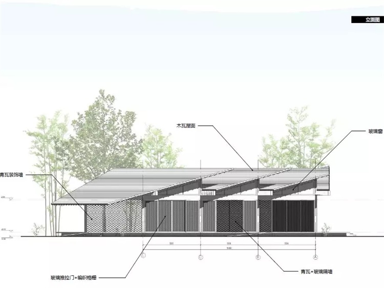 屋面出挑1.5m开敞外廊挑檐空间,形成场地覆盖。东北侧留出一跨架空处理形成主入口;西侧、南侧留有较大挑檐空间,形成与这两侧室外庭院的空间过渡;南侧檐口尽可能压低与近景的竹子和远景的山形成框景;东南侧檐口空间与矮墙形成狭长围合,透过镂空矮墙,原保留的东南侧的植物渗透进庭院内部,形成借景。