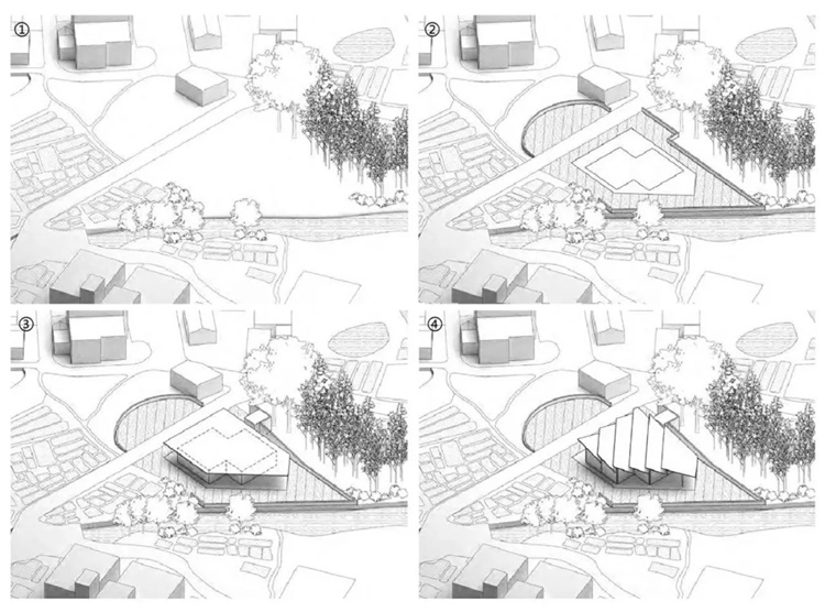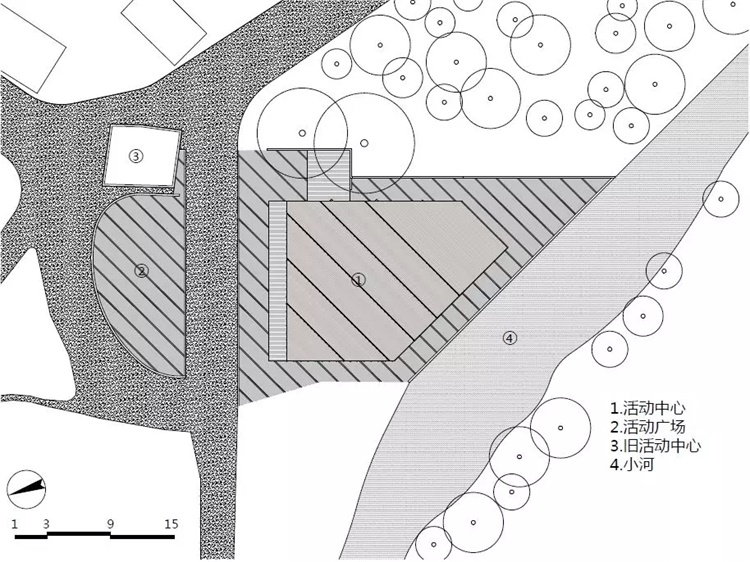 村落文化活动中心所处地块大致呈梯形,中间被东西向村路横穿,划分为南北两块。北侧地块约200平方米,不可设置建筑物,原有几处农宅,现均已拆除。南侧地块约800平方米,为活动中心的设计区域,地块现为荒地。