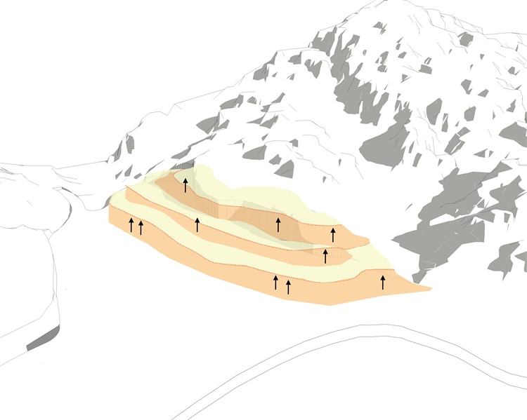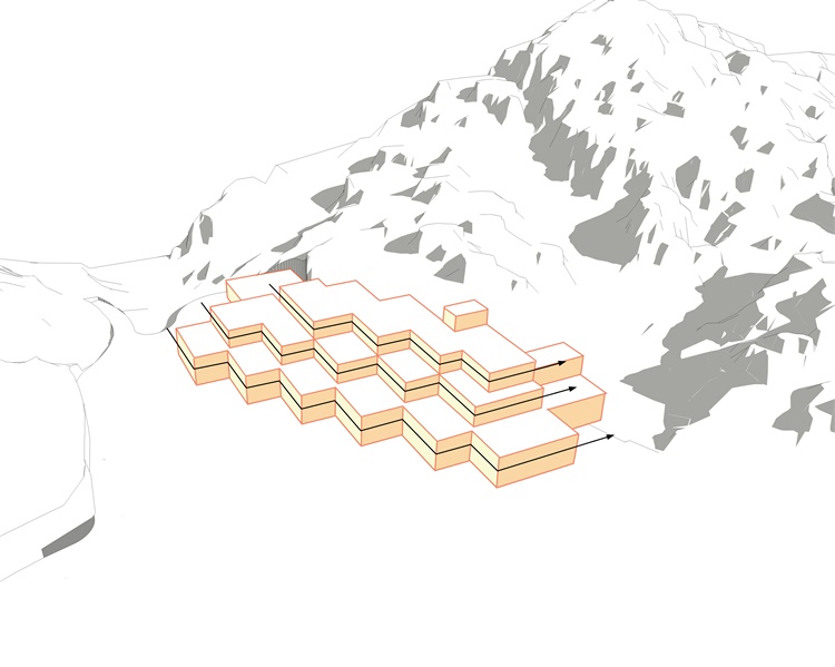 在此基础上,设计团队提出“折叠的水平线”的设计理念:建筑总体呈退台式组织,暗示了建筑作为另类等高线与山体的关系,建筑作为自然环境的一种延续,但又不仅限于对自然的模仿和拟态。