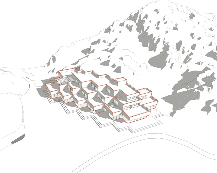 On this basis, the design team made a design concept of “folded horizontal lines”: To employ an architectural organization of set-back mode, which implies the connections of the building as a kind of morphed contour lines to the original massif and an organic extension to the natural environment, yet not simply limited to mechanic imitation and mimesis of the nature.