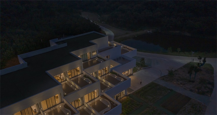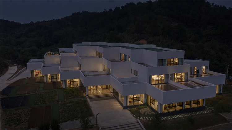 The design team chooses the “stepped construction in set-back mode” as the basic architectural form: The roof of the lower floor serves as the upper room’s outdoor terrace, so that each guest room is endowed with its independent “hanging garden”, which enriches the accommodation experience. As for the guest rooms, through scattered stacking up of the modularized function units like toy bricks, a rhythmical spatial sequence is takes shape, which, meanwhile, maximizes the viewing sides to the west and the south. At the same time, the traffic organization and the para-position of the pipelines with the structure must be guaranteed, to ensure the realization of the architecture in rural context. As for the outdoor set-back terraces, the design team deliberately stagger them on each floor plan, in order to match the protruding corners of the upper architectural contour with the concave corners of the lower one, in which way a relatively individual outdoor space for activities is formed on the same floor plan and the privacy of the guests is protected.