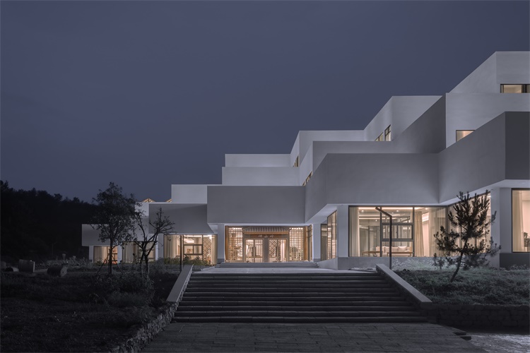The outer walls of the building are all white, which is the intention of the design team to weaken the decorative language on the walls regarding both material and color while strengthening the geometric and constructive characteristics of the architecture. In regard to the processing of the building elevation, horizontal lines and solid bodies are emphasized, while successive and concrete white bands take shape through roof parapets and downward cornices. However, the design pays more attention to detailed varieties, as well, in addition to the sense of order. For example, the courtyard to the east side of the entrance forms a small scenery for the interior space, viewed from three perspectives, and the skylight ceiling of the banquet hall provides the inner space with natural lighting while arousing partial variation of the architectural form.