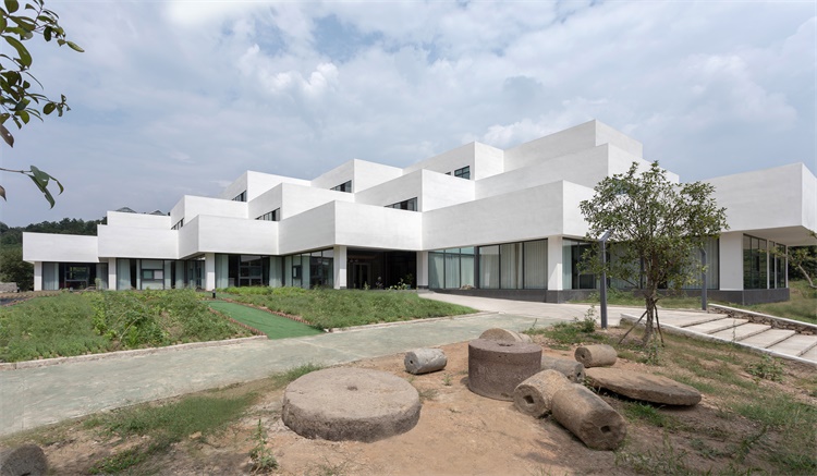 The architectural design concept is based on the reading of the project site, which is located at the intersection of the east-west main road and a northward road. It presents the form of an irregular triangle, which is narrower in the north and wider in the south, with hills to the northwest and –east, but relatively flat and open land to the southwest, where a better opposite scenery is to be found. Before the introduction of the architectural design team, the proprietor has had the site formatted and expanded, the hill to the northeast excavated, which has changed the original environment to a certain extent. Faced with the exposed side slope of a 15-meter height, the design team made a proposal to concede the building from the center to the border of the site, connected to the excavated hill, which not only creates outdoor spaces, but also makes the building an extension of the natural massif, constituting a fundamental arrangement that the building backs onto the mountains in the northeast and faces the waters in the southwest, according with the traditional Chinese Feng-Shui principles.
