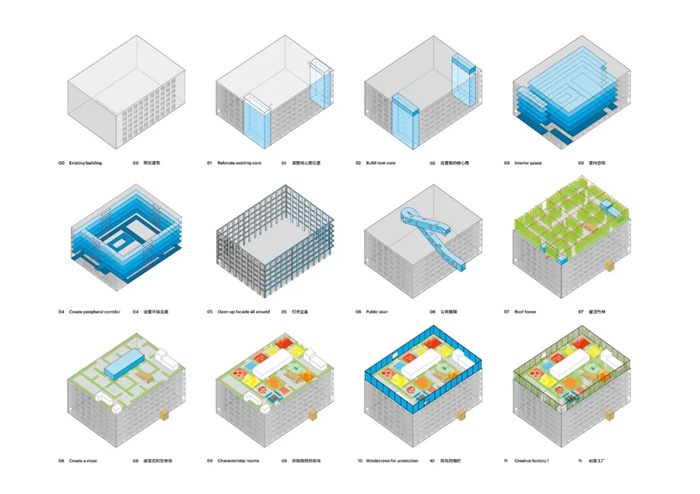 设计方案并不是对废弃厂房的拆除和重建,而是对其进行可持续性的翻新,将其改造为一个“创意工厂”,办公空间由万科城市研究院自用,也可租赁给其他创意公司。设计以一座公共楼梯为核心,使访客可以看到内部的活动,并通向一个风景优美的公共屋顶露台——“绿色之家”。