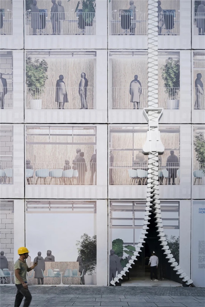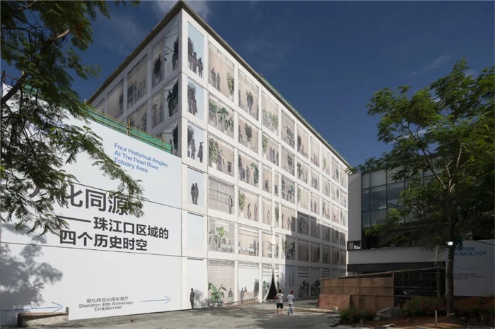 临时的帆布立面便于在施工过程中使用。临时立面展示了建筑完工后的外观,并采用大拉链设计,拉开帆布可通往底层,目前正在举办“万化同源”献礼深圳特区40周年的展览。一旦不再需要,帆布将被回收并制作为手提袋,使这种临时措施成为配合该项目循环经济考虑的另一个要素。MVRDV也与Studio Boris Maas合作,为展览“漫游.南头延生”特别设计了椅子,将在南头新生场展出。