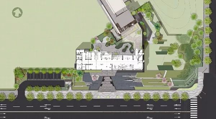 建筑不仅是城市的文化场所,同时为新城金郡项目提供最好的展示空间。建筑的入口区、沙盘展示区与内庭景观的空间均采用通透材质划分,使室内空间可以一直延伸至外部庭院,室内结合悬挑玻璃砖和吊顶波纹不锈钢板将建筑内外的山水意向联系起来,延续自由灵动、自然雅致的空间主题。