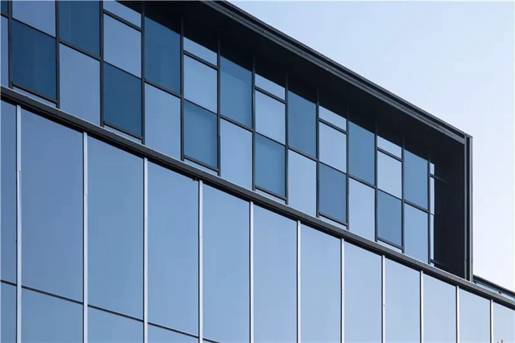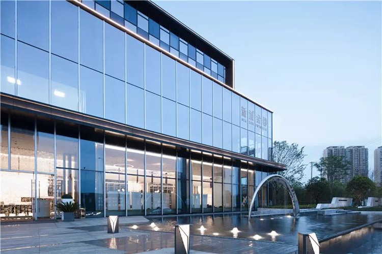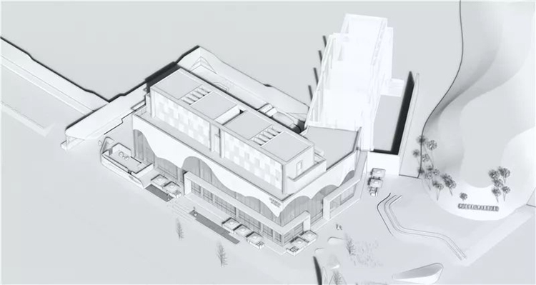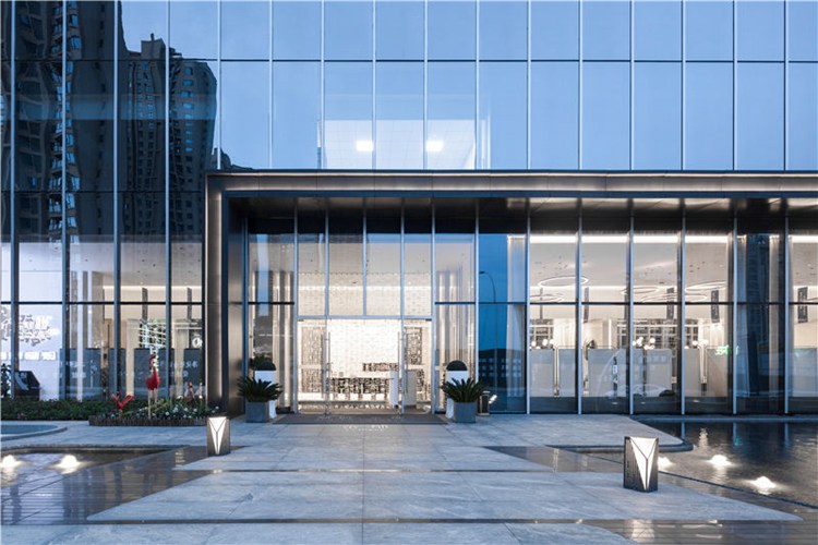 立面设计方面,提取江夏的江湖山水文化元素,顶层玻璃形式凸显“山川层叠”的意象,一、二层利用“水波”体现自由、灵动之感,玻璃幕墙中若有若无的曲线造型,结合室内的灯光与室外的水景相互呼应,恰如王维诗中描绘的“江流天地外,山色有无中”。首层的铝板雨棚强化主入口的标识性,并为通透的建筑增添张力。