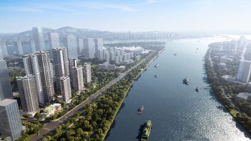 在整体立体空间结构的设计上,团队将以经二路城市活力轴、南侧滨江界面与东侧长沙涌景观带为核心的城市界面组团规划。在设计上呼应轴线,达到开阳透绿、面江纳景的通透开阔视觉,塑造对内对外的多元平衡,打造活力轴的门户感;空间上将滨江绿地渗透到建筑组团中,充分利用河涌、江面等景观资源,并通过设计手法打造错落有致的城市景观界面实现自然景观与都市交融的现代品质生活体验方式。
