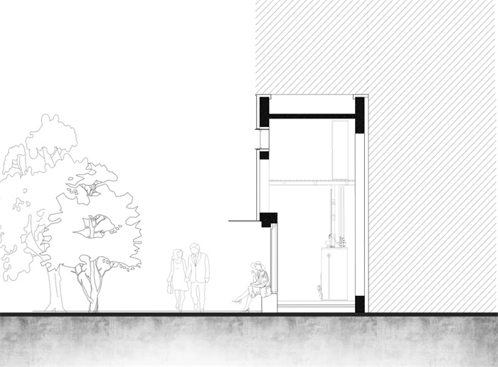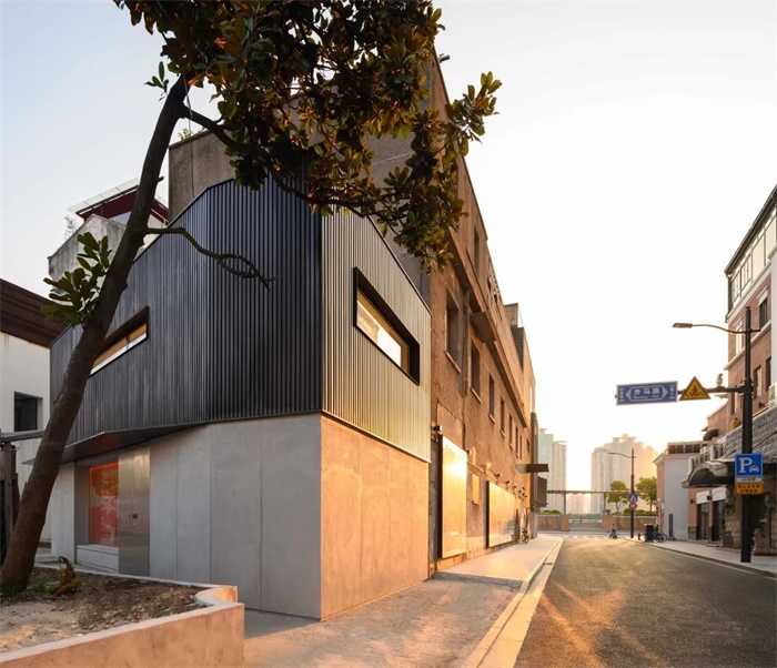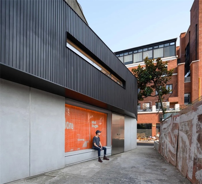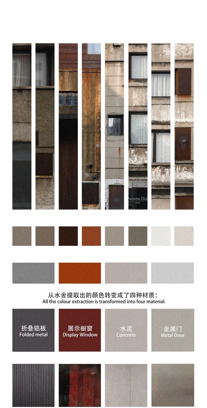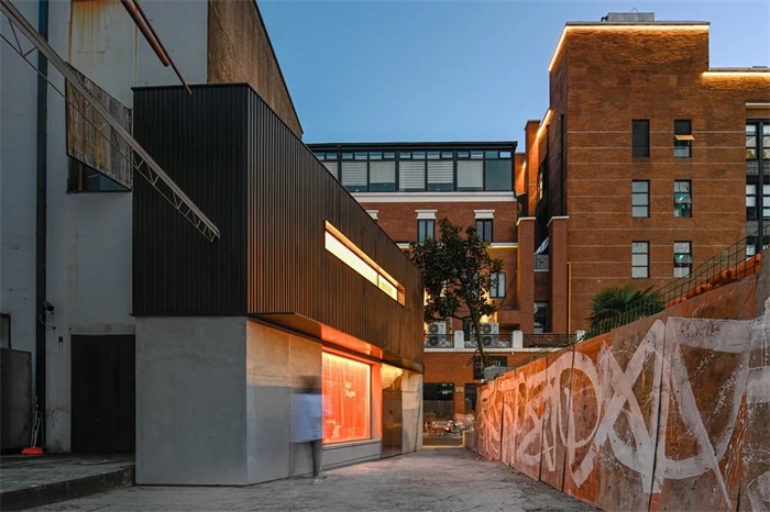 在材料的选择上,建筑师从周边环境中提取出折叠铝板、水泥材质和色彩元素,将过往的时间以材料的形式凝固。新老材料的直接对比,加大过去和现在之间的距离感,反衬出场地之间的时间流动,历史成为一个背景化的封闭场所。