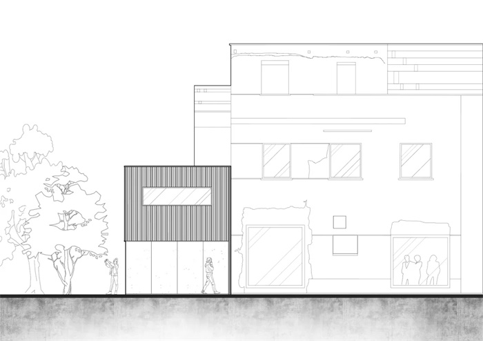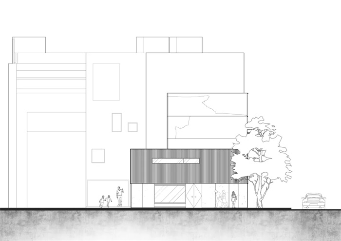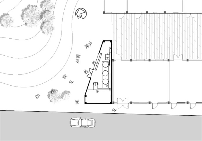微改造位于建筑的端头,沿着街道的方向,随着人流导向自然而然形成流动的轴线,将工业场地氛围“流动”过渡到公共开放的场地氛围中。所以与原建筑相接的立面,形成封闭底层,延续封闭感,但同时微改造的高度远低于建筑高度,封闭感也在持续减弱,人群和状态继续“流动”,到达微改造的另一侧,一个开放的并且设有接纳性座位的空间,封闭感全部“流走”,有序的流动生成过渡性的场地造景。