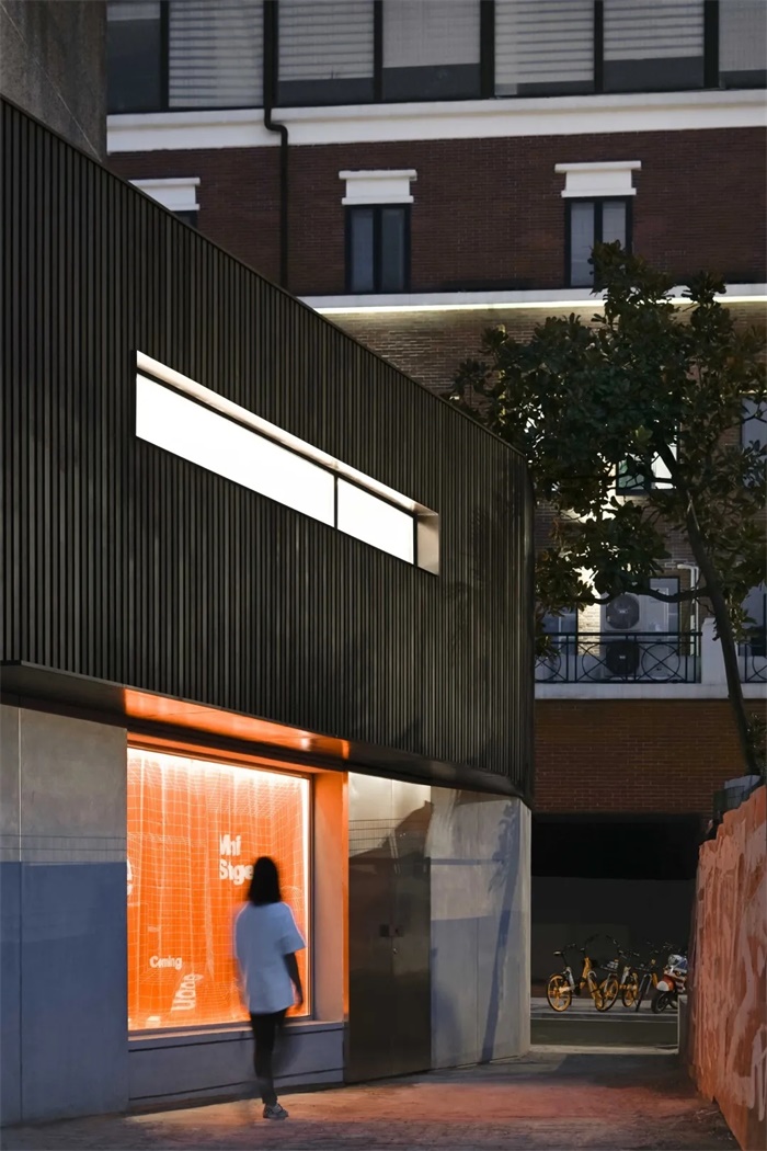 在面向城市公园开放的场地中,增加文旅展示窗,立面嵌入一体化的现代造型雨棚、灯光及休憩座椅,强化流动后的开放互动性,建立一种新的观景方式。建筑中的小公共空间与场地中大公共绿地空间对接,将曾经被同化的图像转变为沉浸式体验之中。