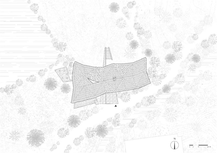 “云朵”投下的阴影自然就是建筑的空间。受 KaareKlint 1933年设计Safari 户外椅结构原理的启发,建筑师让建筑的支撑结构随着地形的高低起伏而调整,每个边的长度既不固定,也不一致,根据场地条件的变化而变化。整体像是趴伏在草地上的巨大帐篷。这样的结构也与业主对于该建筑的功能定位相呼应。项目场地周围既有平整的草地,又有天然水泊和林地,自然状态下就是露营的好去处。一个“帐篷”形状的营地建筑自带户外感。