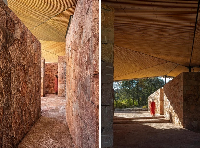 除了结构上的自在,落云自然体验中心的建筑在取材上也好似“信手拈来”。地面和墙体连成一体,都用同一种产自丽江本地的石头砌成。建筑内外不做多余的装饰,诚实地裸露出石头本来的颜色和质感。这种石头只产自当地贵峰村,呈现出十分特别的、像火烈鸟一样的粉红色。由于这种石料的大面积使用,整个建筑与颇有野性的云南大环境和野趣十足的所在场地形成色彩上的强烈对比。“红房子”这个随意的名字也由此在工人们的口口相传中得来。