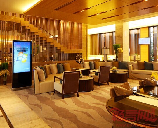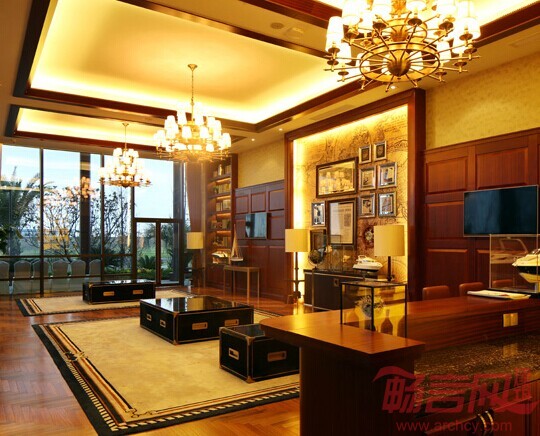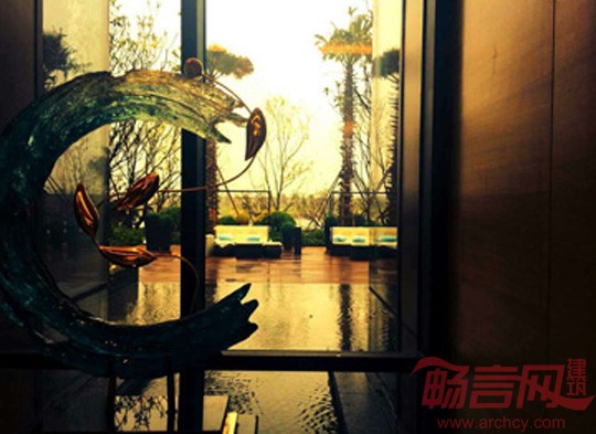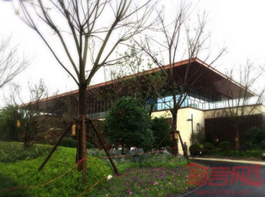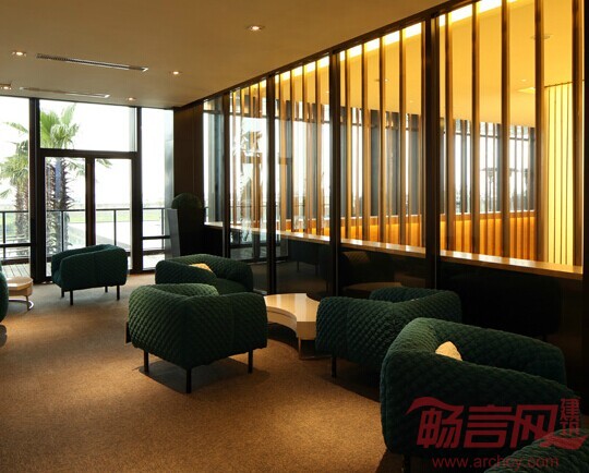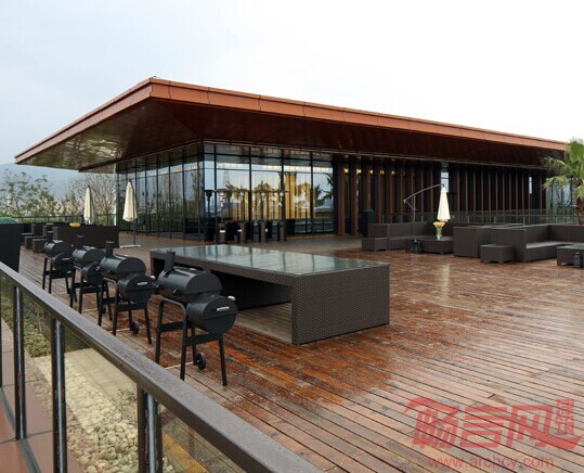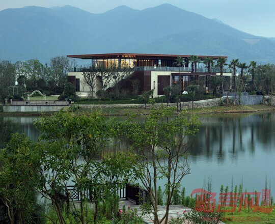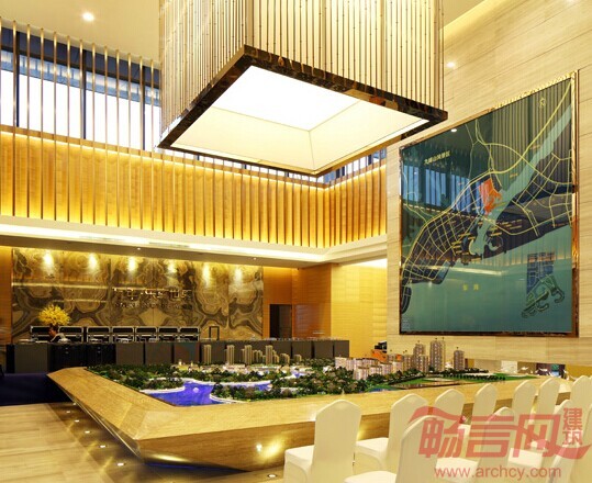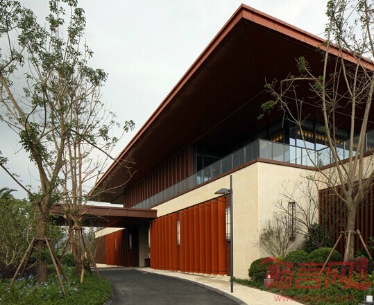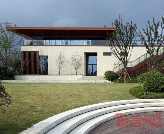 乐享世界售楼处示范区以简洁现代的设计手法演绎“新亚洲风情”。宽阔而出挑深远的钢制大屋顶覆盖着二层水平展开的建筑体量,为建筑提供了荫蔽,阻挡了夏季的炎炎烈日。沿明月湖展开的“L”型建筑布局,充分利用了朝向湖景的良好视野,通透的落地玻璃窗使公园四时美景一览无遗。二层宽大的木地板露台空间则为登高远眺海景的人们提供了极佳的视野。建筑立面材质为米黄色干挂石材与大面积的透明玻璃相结合,并加入精巧的木质百叶、格栅与钢制装饰条,充分展现了现代精致的度假建筑风格。
